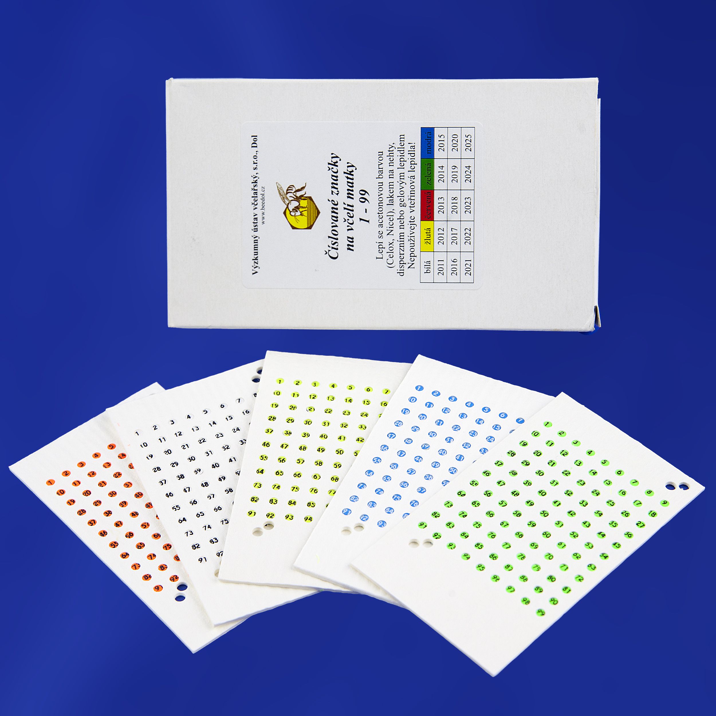 Značení matek V roce 2012 žlutá. Rok končí číslem 1 nebo 6 bílá Rok končí číslem 2 nebo 7 žlutá Rok končí číslem 3 nebo 8 červená Rok končí číslem 4 nebo 9 zelená Rok končí číslem 5 nebo 0 modrá Značení matek se nejčastěji provádí až po oplození v oplodňáčku a nebo dokonce při jarní prohlídce ve včelstvech. Dobrou variantou je i označení ihned po vylíhnutí v líhni i neoplozené matky. Sám s tímto včasným označením zkušenosti nemám.