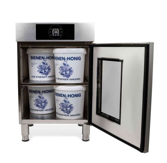 Teplovzdušný ventilátor: Integrovaný teplovzdušný ventilátor rovnoměrně a účinně ztekutí med. Med se přibližně za 12-24 hodin ztekutí v závislosti na množství a počáteční konzistenci.