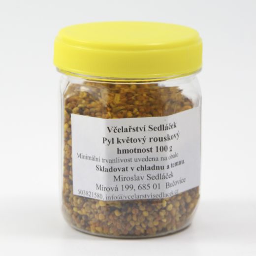 Doplněk stravy. Pyl rouskový - základní potrava včel. Přinášený včelami v rouskách na zadním páru noh. Získává se v podobě pylových rousek.